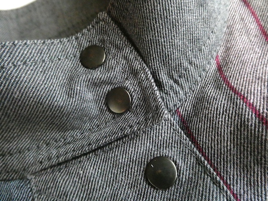 フロントの開き以外にもアームホールやポケット縁にも飾りスナップが並びます