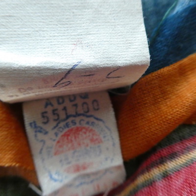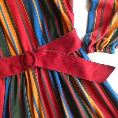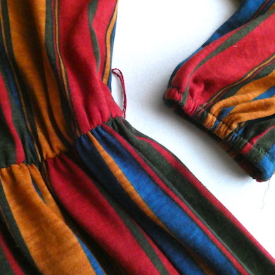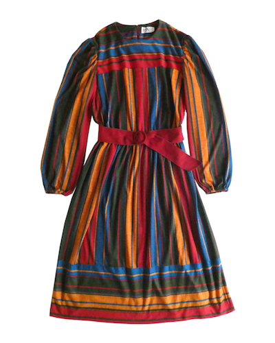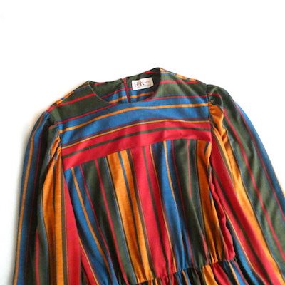 70’s puff sleeve brown poly dress & 70’s multi color stripe long sleeve dress